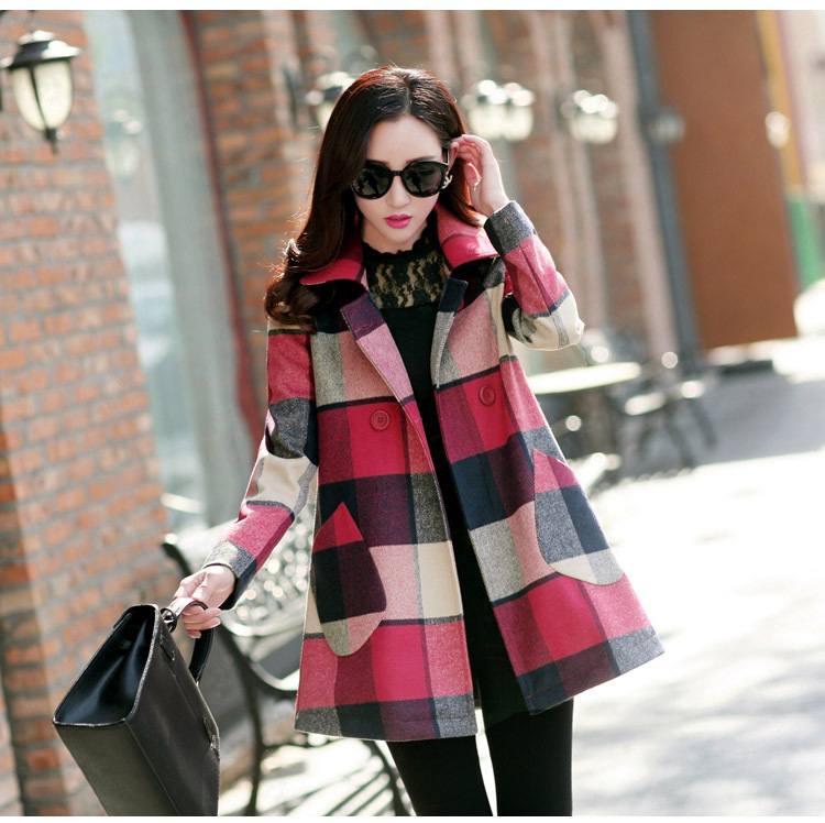 2015秋冬新款女裝韓版毛呢外套女中長(zhǎng)款呢子大衣格子風(fēng)衣女 /