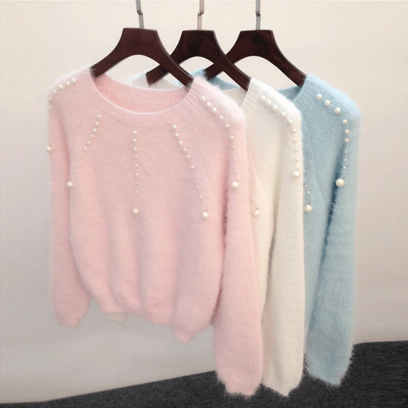 韓國東大門 秋冬新款女裝珍珠釘珠長袖毛茸茸仿貂絨毛衣女 /