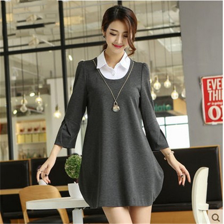 2015胖mm秋裝大碼女裝中長款假兩件顯瘦襯衫領長袖秋冬打底連衣裙 /