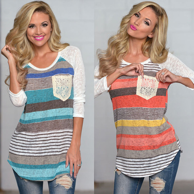 熱賣新品印花條紋口袋不規(guī)則長袖t恤女裝 /