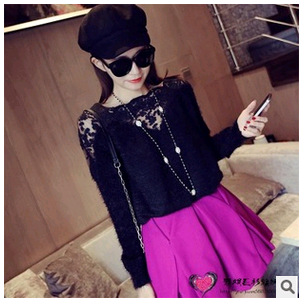2015春裝新款女 韓版寬松肩拼接鏤空蕾絲V領兔毛打底針織衫 毛衣 /