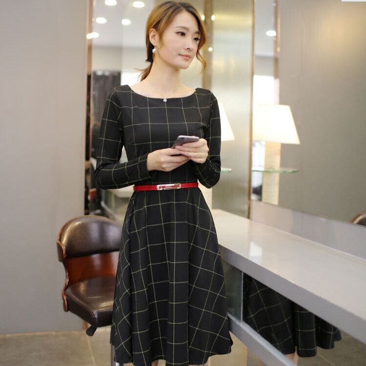 2015秋裝新款女裝韓版中長款修身顯瘦系腰帶一字領格子長袖連衣裙 /