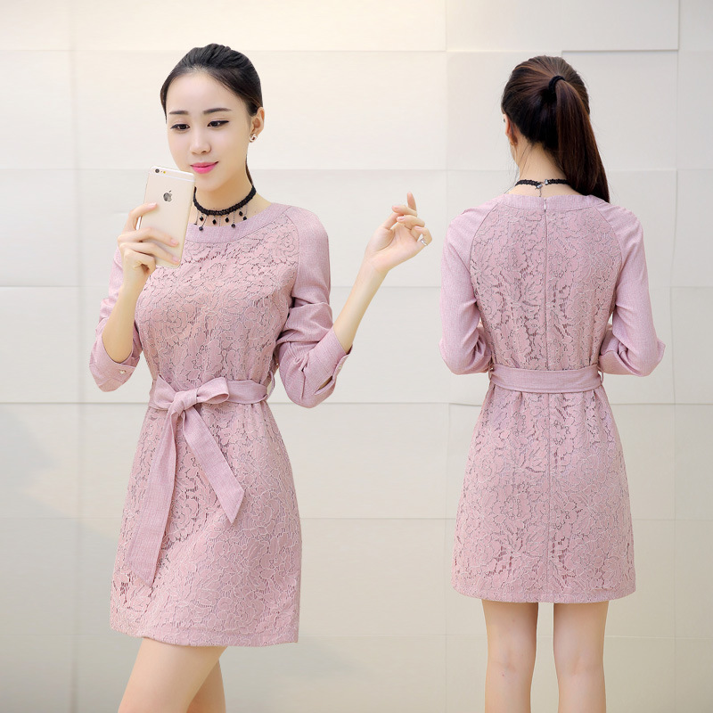 2015秋裝新款韓版女裝 圓領長袖氣質顯瘦打底A字裙 蕾絲連衣裙秋 /