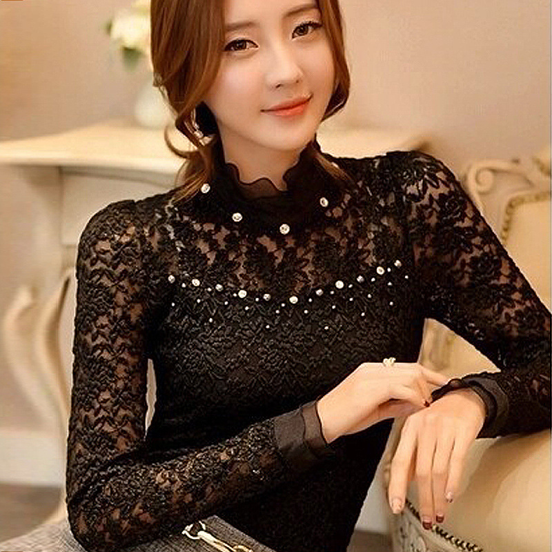 實拍2015秋冬新款韓版大碼女長袖娃娃領釘珠蕾絲衫上衣打底衫956 /