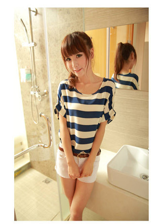 歐美拼色條紋 簡約百搭寬松圓領(lǐng)短袖雪紡衫 /