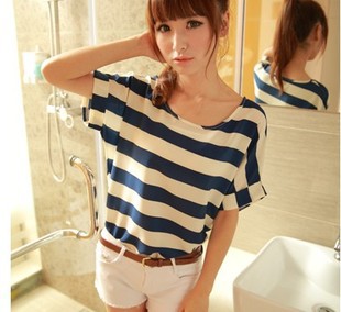 新款夏裝季韓版寬松大碼條紋衫超薄涼爽雪紡衫短袖T恤罩衫 /