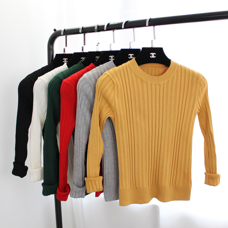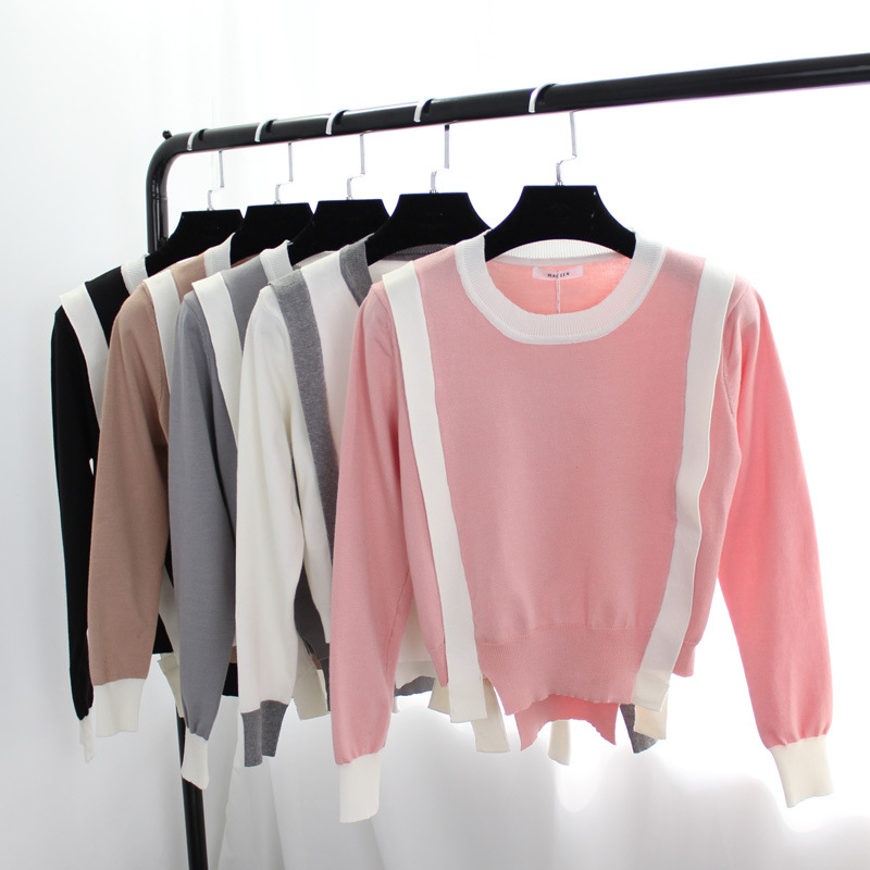 2015秋冬新款韓版潮短款修身顯瘦豎紋針織打底長袖套頭圓領女 /