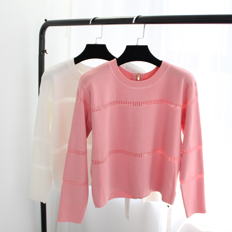 2015春秋新款歐美寬松套頭針織衫背后拉鏈圓領短款鏤空毛衣外套女 /