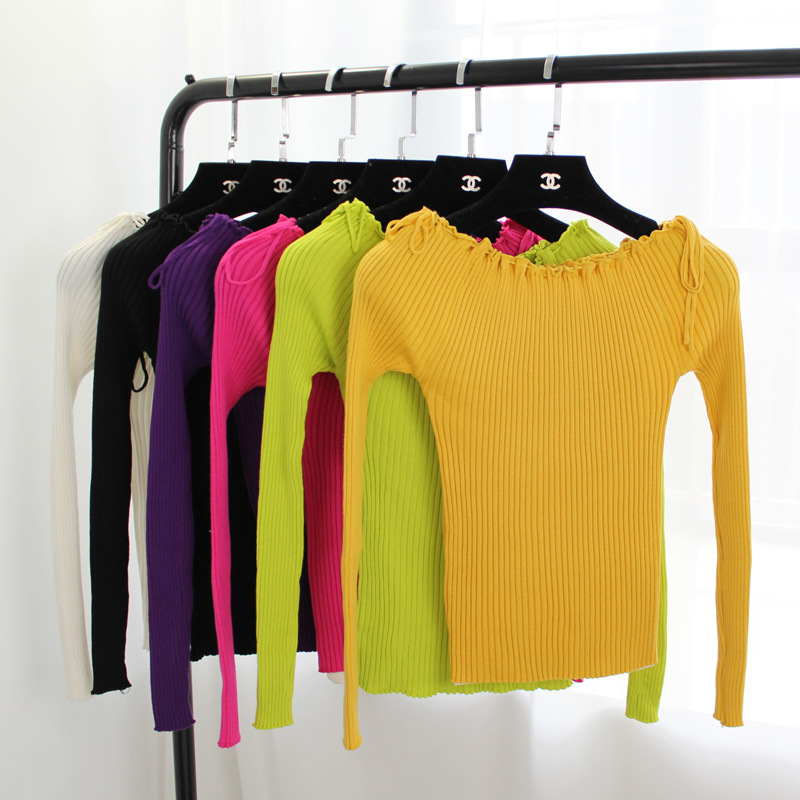 2015秋冬季女韓版露肩抽繩系帶兩穿一字領修身顯瘦基礎打底針織衫 /