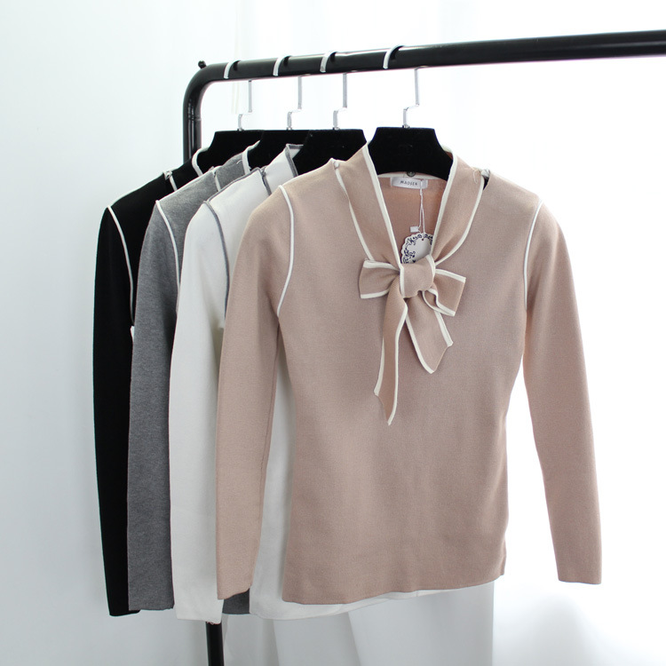 2015秋季新款韓版蝴蝶結V領長袖百搭修身顯瘦套頭打底針織衫女潮 /