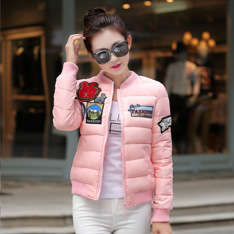 2015冬裝新款韓版棒球服立領棉衣徽章時尚修身短款羽絨服女款批發 /