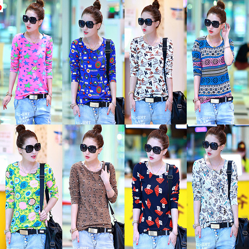 秋冬新款女裝羊絨面料長袖T恤韓版圓領印花套頭女式t恤 長袖t桖女 /