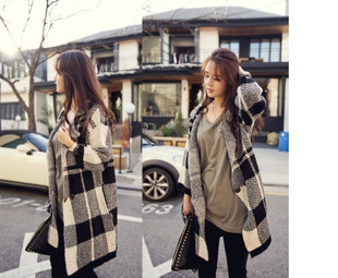 韓國大牌氣場寬松針織衫毛衣外套 女 時尚靚麗格子開衫雙鈕扣大衣 /