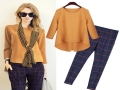 歐美街頭長袖上衣女裝T恤衫格子休閑褲兩件套休閑時尚套裝 /