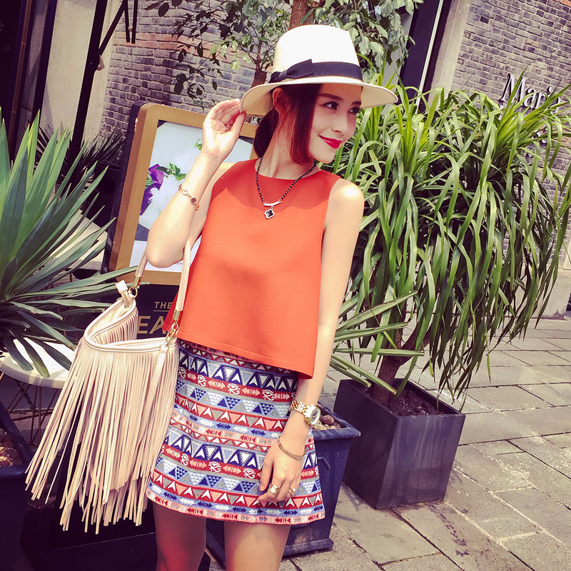 今日團2015夏裝新款時尚名媛氣質(zhì)A字背心+復(fù)古顯瘦短裙套裝 /