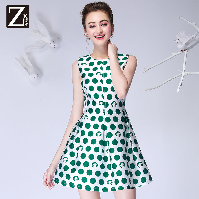 臻汐2015秋裝新款甜美波點無袖連衣裙夏裝修身大擺背心裙女 /