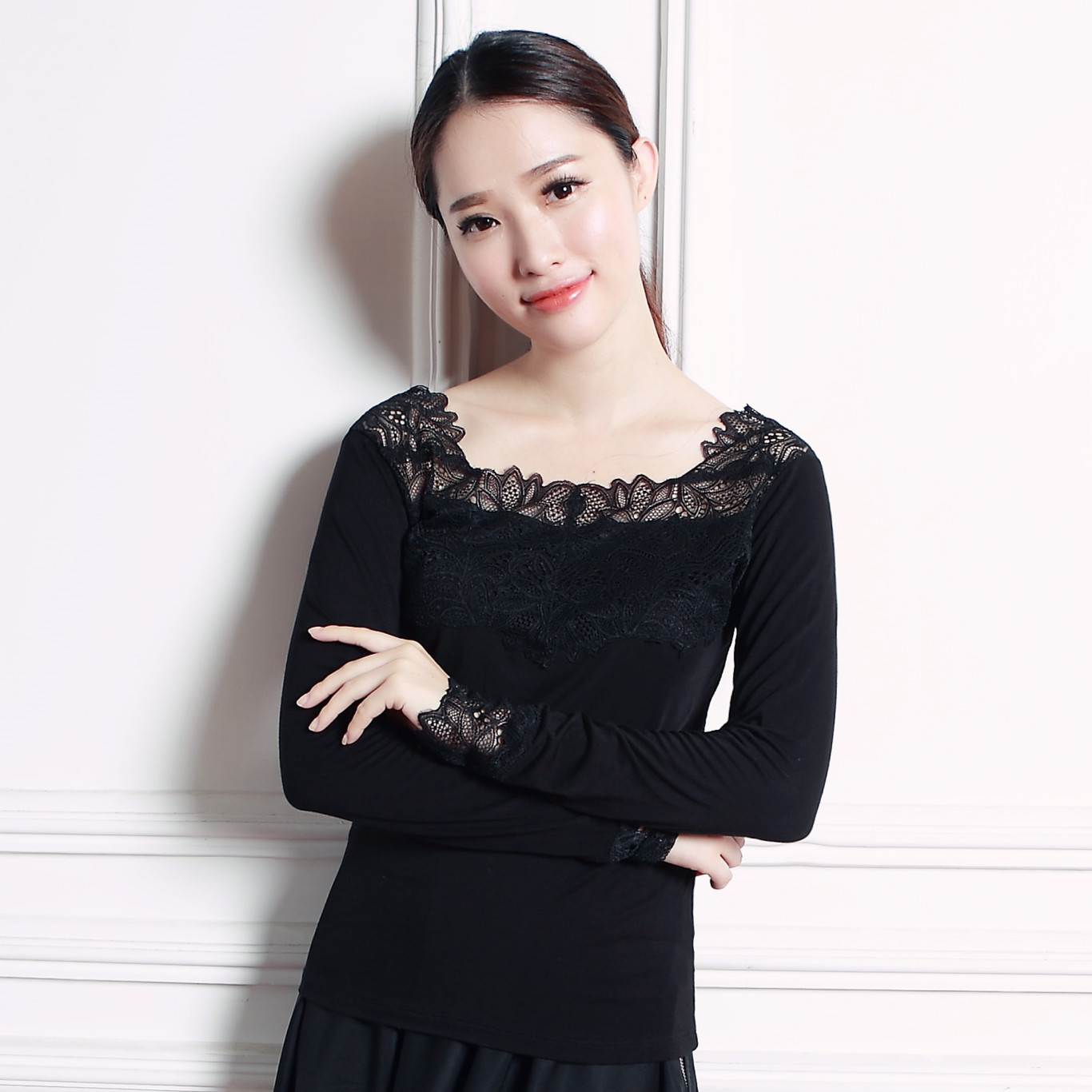 秋季新款韓版修身長袖莫代爾V領打底上衣百搭純色蕾絲衫打底衫 /