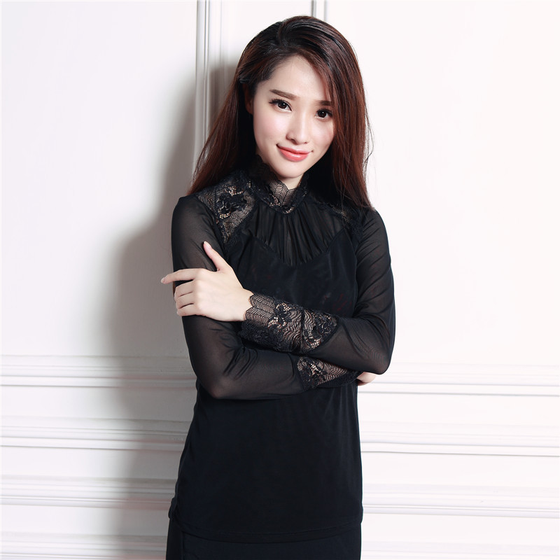 2015新款韓版秋冬女式修身大碼蕾絲打底衫紗網半高領內搭T恤 /