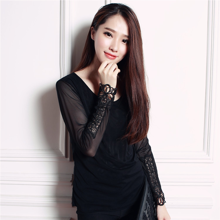 研之伴15年韓版秋衣蕾絲打底衫 圓領鏤空彈力修身紗衣t恤長袖女批發 /