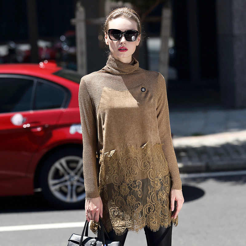 【網眼蕾絲】2015秋季歐美新品 麂皮絨拼接高領性感打底女衫5120 /