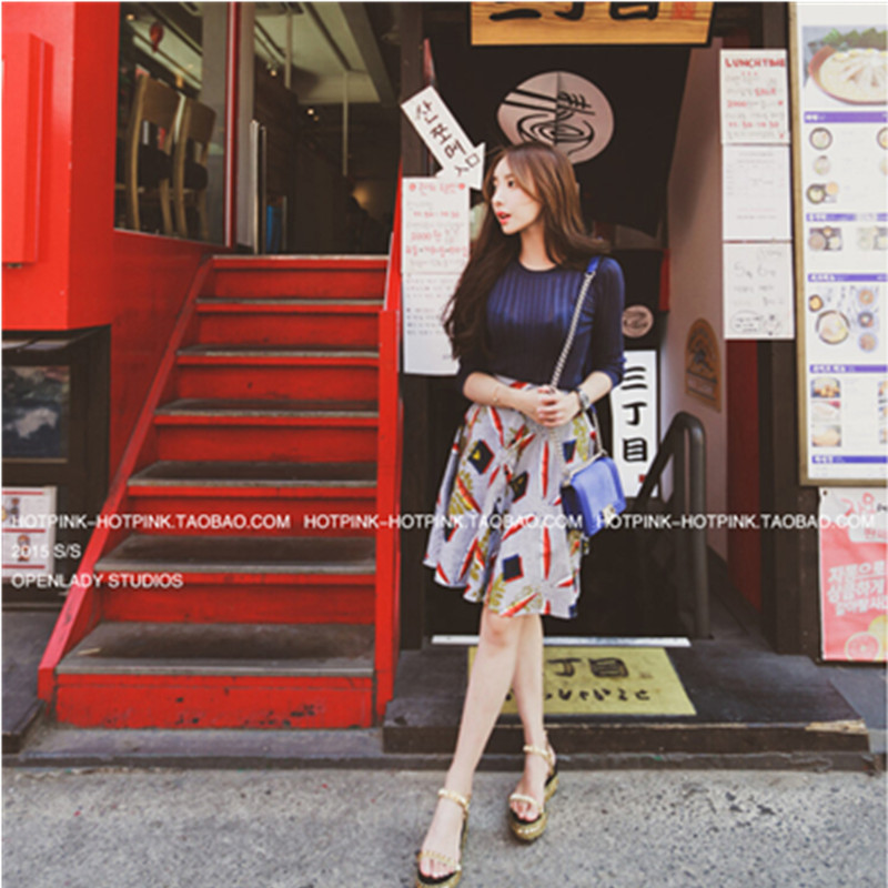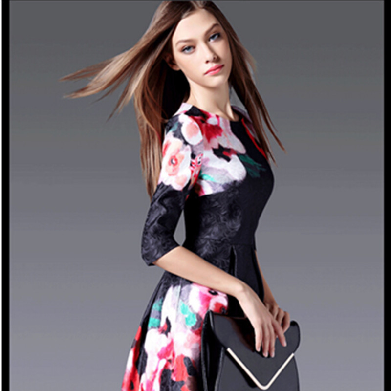 2015秋冬季新歐洲站時尚印花熱賣潮流大碼連衣裙女高腰顯瘦A字裙 /