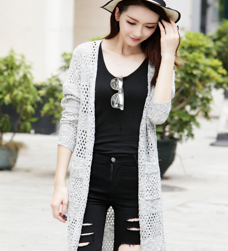 2015秋裝韓版新款口袋大碼中長款鏤空女裝針織開衫外套女百搭 /