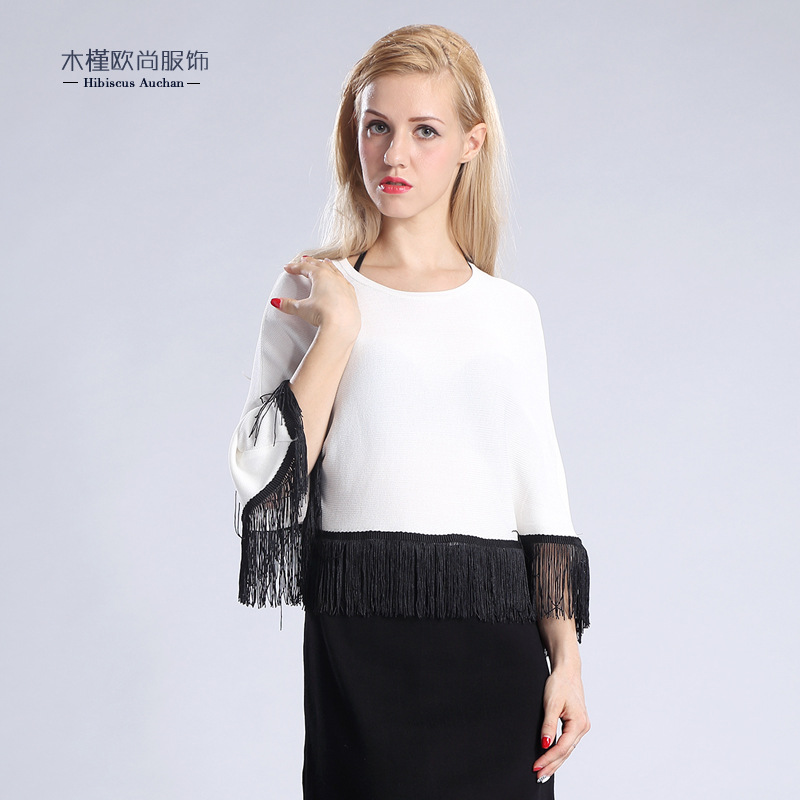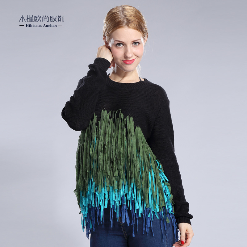 2015歐洲站秋季新款寬松圓領彩色流蘇套頭針織衫毛衣女 /