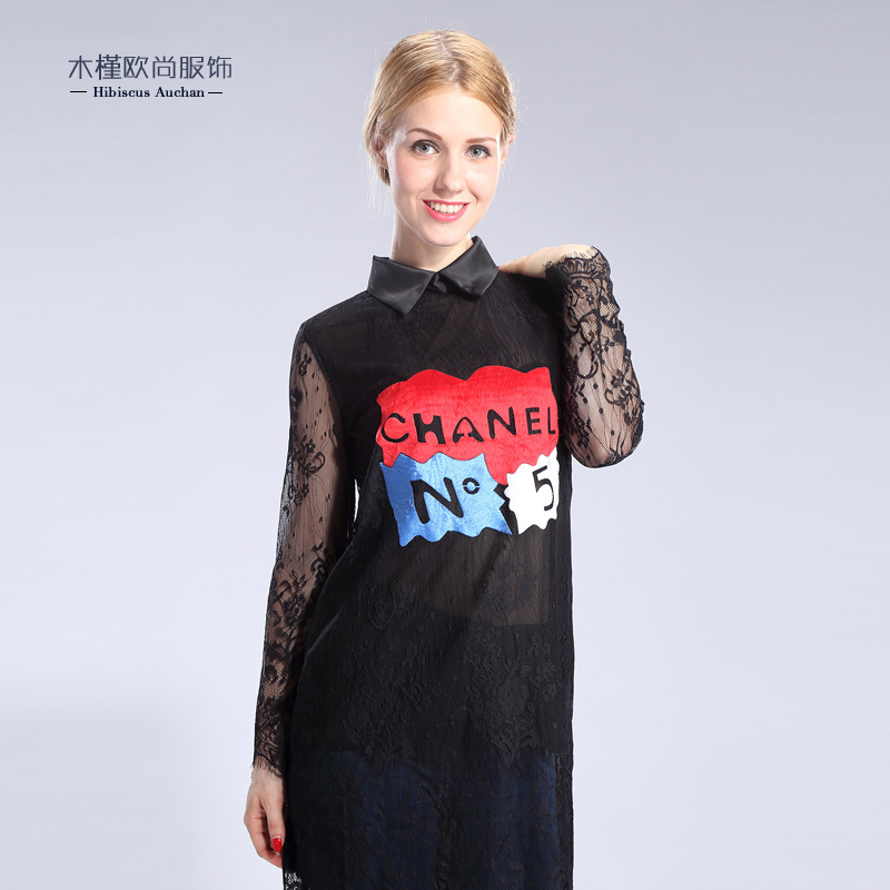 2015歐美大牌女裝大碼上衣中長款翻領修身顯瘦長袖蕾絲打底衫潮 /