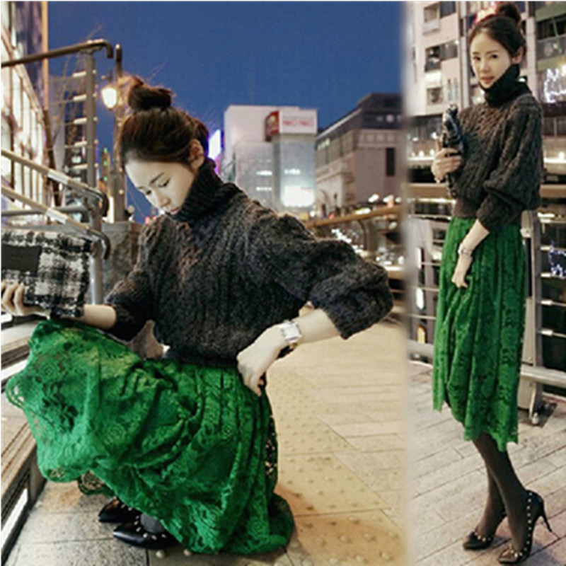 連衣裙女秋裝長袖兩件套套裝女 2015韓版高領毛衣+蕾絲半身中長裙 /