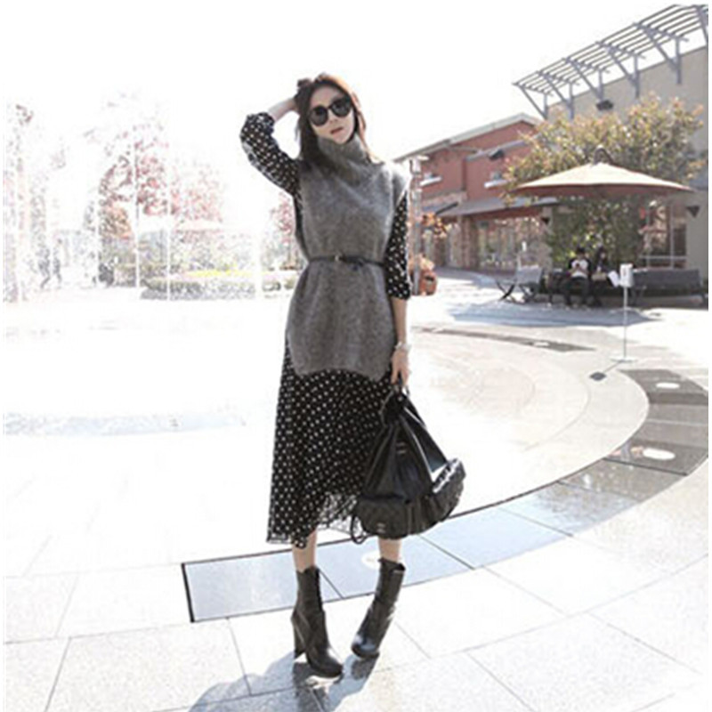 高領毛衣針織+圓點雪紡長裙連衣裙時尚兩件套潮2015秋冬韓版女裝 /
