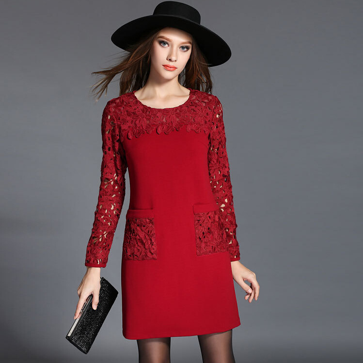 歐美時尚寬松大碼女裝秋裝新款胖MM顯瘦蕾絲拼接打底長袖連衣裙女 /