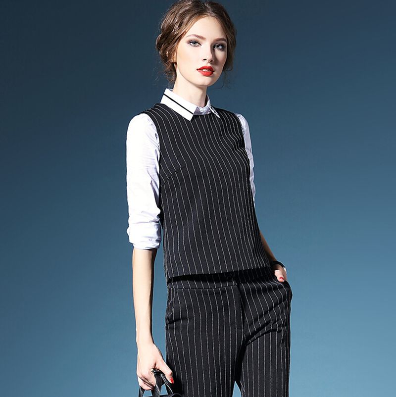 2015秋季新款歐美高端翻領襯衫條紋馬甲鉛筆褲顯瘦三件套時尚套裝 /