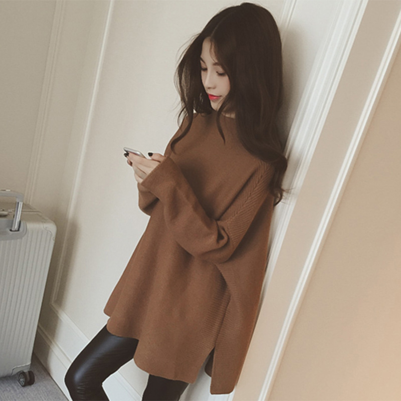 2015新款韓版下擺開叉時(shí)尚半高領(lǐng)寬松套頭針織衫中長款長袖毛衣女 /