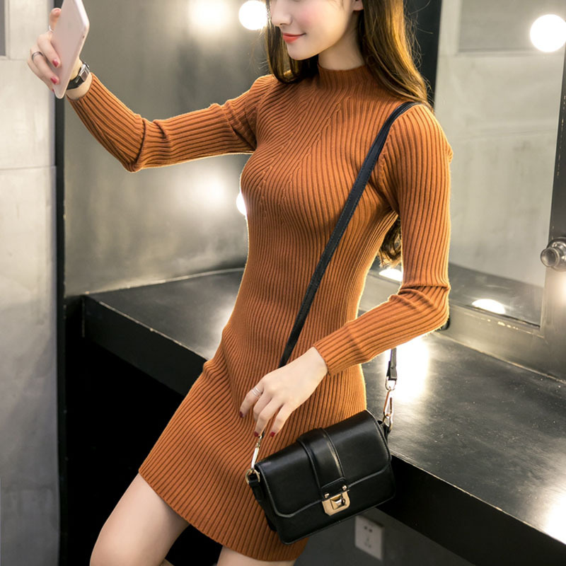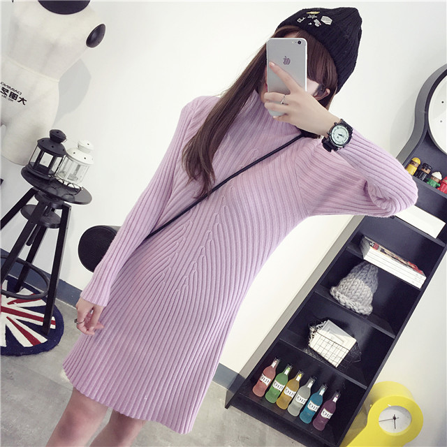 秋冬新款半高領(lǐng)毛衣套頭加厚中長款韓版修身連衣裙女包臀針織打底 /