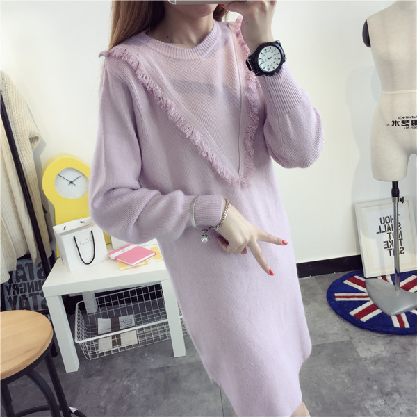 包郵女士毛衣針織衫純色流蘇外套秋冬女套頭毛衣女打底衫中長款潮 /