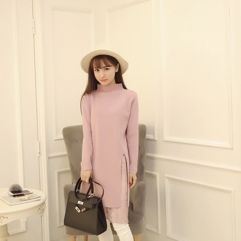 2015冬裝新款女裝韓版針織衫打底衫女冬蕾絲中長款包臀套頭毛衣女 /