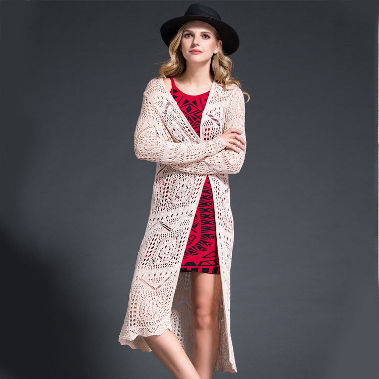 2015秋季新款毛衣女 歐美中長款開衫外套寬松鏤空毛織長外套批發 /