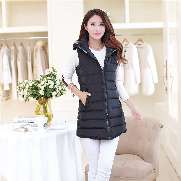 2015冬季新款女式棉馬甲 韓版純色連帽中長款時尚棉衣廠家直銷 /