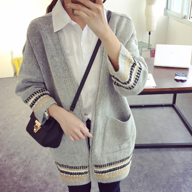 批發(fā)15秋裝新款韓版寬松大碼針織衫提花口袋中長款毛衣開衫外套女 /
