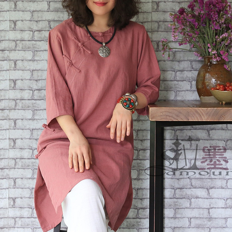 春秋女裝民族風 棉麻布衣 文藝復古盤扣 七分袖大襟衣 襯衣連衣裙 /