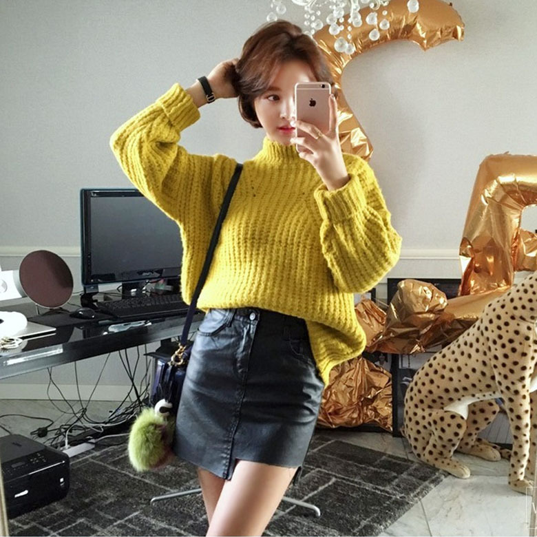 東大門代購 2015秋冬新款氣質套裝 寬松高領毛衣+PU皮裙兩件套裝 /