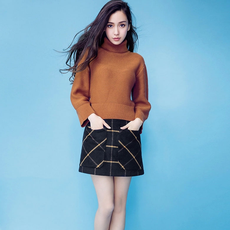 明星楊穎同款套裝女 2015秋冬新款氣質高領毛衣+格紋毛呢包臀短裙 /