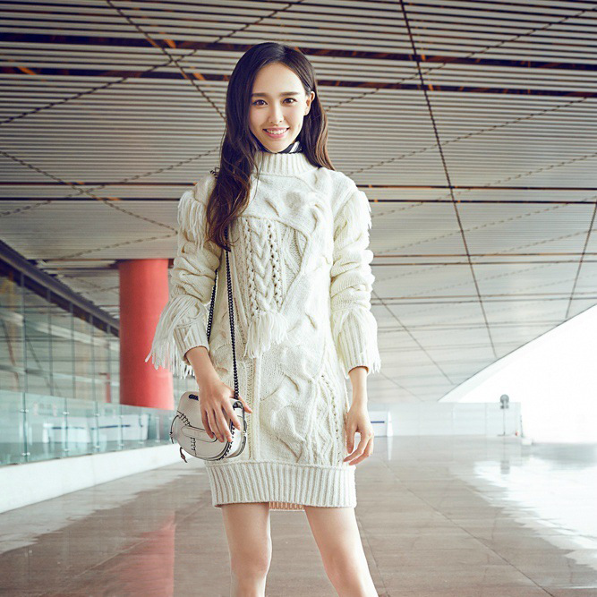 唐嫣明星同款機場2015秋冬連衣裙韓版寬松長款毛衣裙女套頭流蘇潮 /