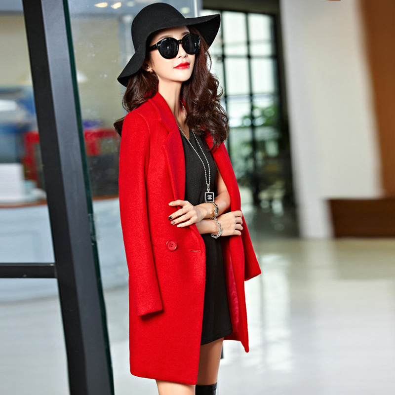 2015秋冬裝新款毛呢外套女韓版中長款翻領風衣一粒扣修身呢子大衣 /