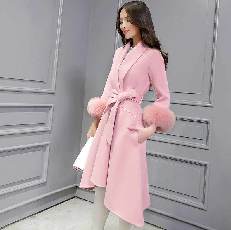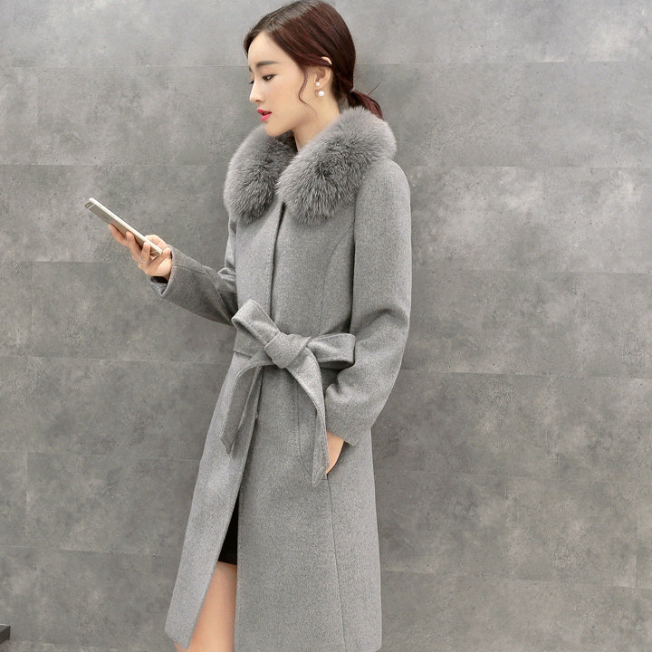 2015冬裝新款羊絨呢子大衣毛呢外套女中長款真狐貍大毛領修身系帶 /