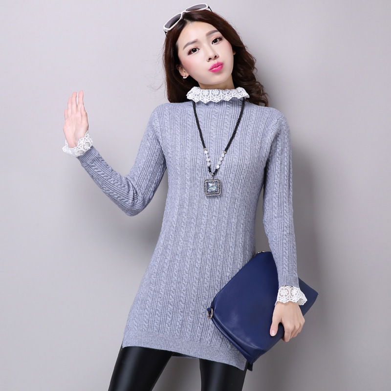 2015冬季新品女裝時(shí)尚百搭顯瘦中長款蕾絲花邊針織衫女 /
