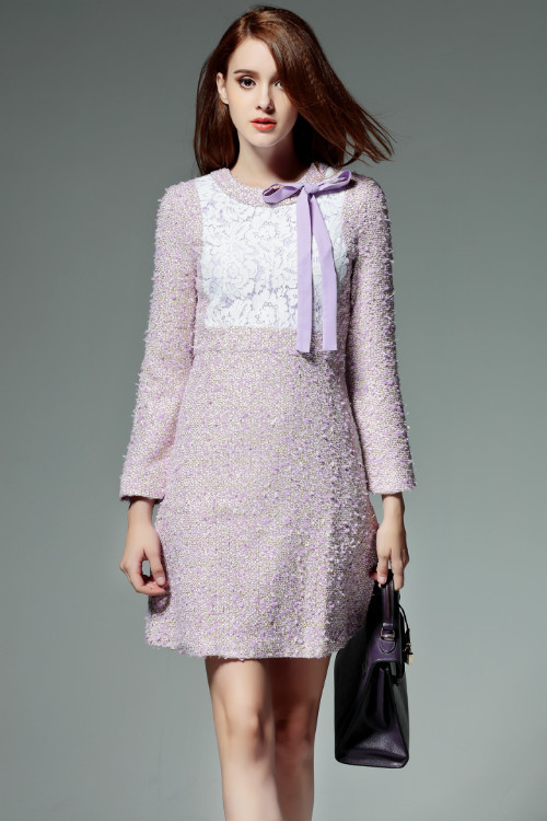 2015年秋冬新款女裝歐洲站小香風(fēng)蕾絲拼接蝴蝶結(jié)甜美連衣裙 /
