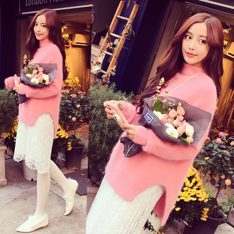 2015冬裝新款胖MM前短后長開叉甜美套頭長袖寬松 貂絨毛衣外套女 /
