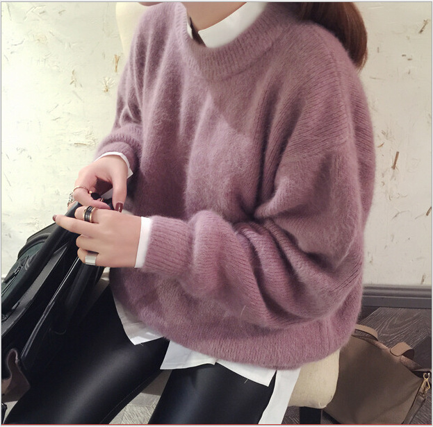 韓國東大門女裝水貂絨純色套頭針織毛衣 秋冬女式寬松顯瘦上衣 /