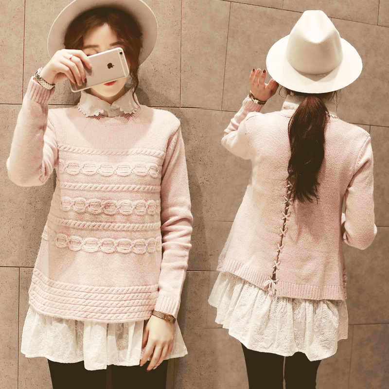 韓國粉色甜美翻領(lǐng)無袖襯衫開叉下擺針織兩件套 條紋麻花套頭毛衣 /